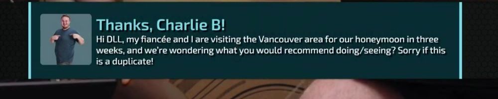 Thanks, Charlie B! Hi DLL, my fiancée and I are visiting the Vancouver area for our honeymoon in three weeks, and we're wondering what you would recommend doing/seeing? Sorry if this is a duplicate!