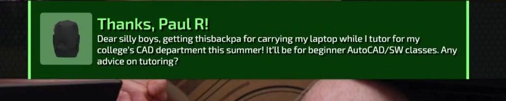 Thanks, Paul R! Dear silly boys, getting thisbackpa for carrying my laptop while I tutor for my college's CAD department this summer! It'll be for beginner AutoCAD/SW classes. Any advice on tutoring?