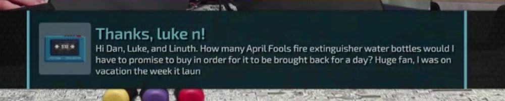 Hi Dan, Luke, and Linuth. How many April Fools fire extinguisher water bottles would I have to promise to buy in order for it to be brought back for a day? Huge fan, I was on vacation the week it laun