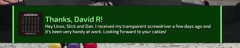 Hey Linus, Slick and Dan. I received my transparent screwdriver a few days ago and it's been very handy at work. Looking forward to your cables!