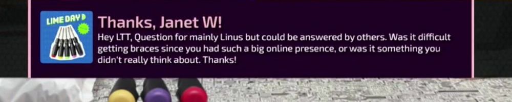 Hey LTT, Question for mainly Linus but could be answered by others. Was it difficult getting braces since you had such a big online presence, or was it something you didn't really think about. Thanks!