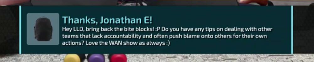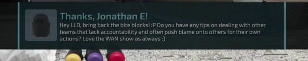 Hey LLD, bring back the bite blocks! :P Do you have any tips on dealing with other teams that lack accountability and often push blame onto others for their own actions? Love the WAN show as always :)