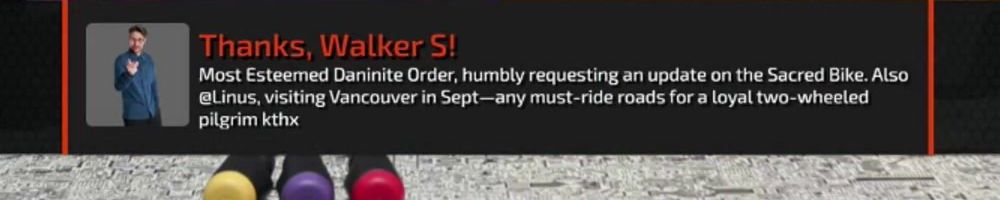 Most Esteemed Daninite Order, humbly requesting an update on the Sacred Bike. Also @Linus, visiting Vancouver in Sept—any must-ride roads for a loyal two-wheeled pilgrim kthx