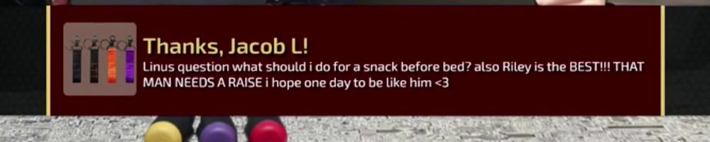 Linus question what should i do for a snack before bed? also Riley is the BEST!!! THAT MAN NEEDS A RAISE i hope one day to be like him <3