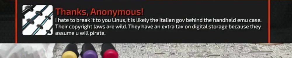 I hate to break it to you Linus, it is likely the Italian gov behind the handheld emu case. Their copyright laws are wild. They have an extra tax on digital storage because they assume u will pirate.