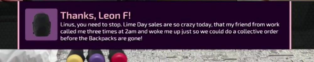 Linus, you need to stop. Lime Day sales are so crazy today, that my friend from work called me three times at 2am and woke me up just so we could do a collective order before the Backpacks are gone!