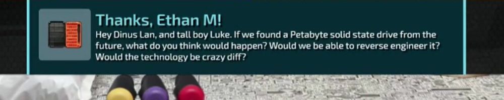 Hey Dinus Lan, and tall boy Luke. If we found a Petabyte solid state drive from the future, what do you think would happen? Would we be able to reverse engineer it? Would the technology be crazy diff?