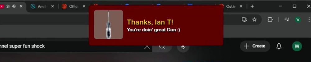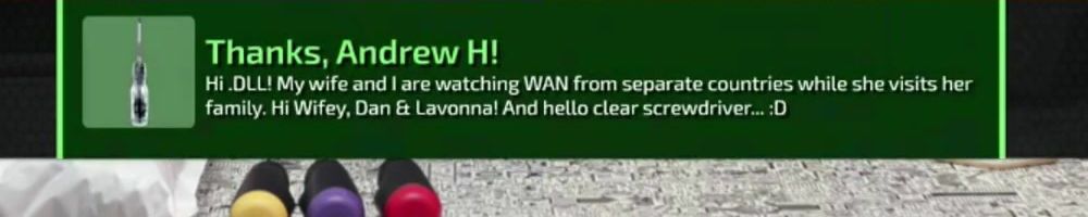 Hi .DLL! My wife and I are watching WAN from separate countries while she visits her family. Hi Wifey, Dan & Lavonna! And hello clear screwdriver... :D