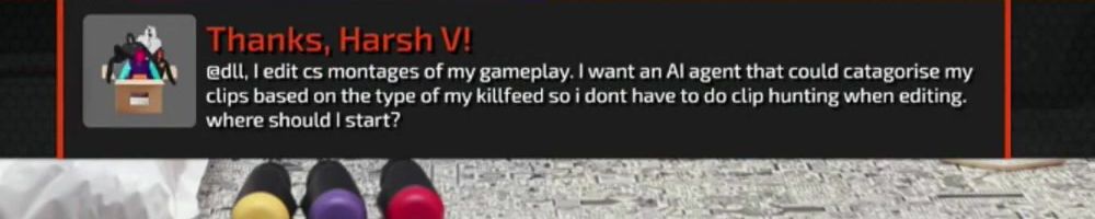 @dll, I edit cs montages of my gameplay. I want an AI agent that could catagorise my clips based on the type of my killfeed so i dont have to do clip hunting when editing. where should I start?