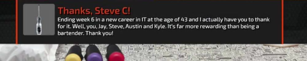 Ending week 6 in a new career in IT at the age of 43 and I actually have you to thank for it. Well, you, Jay, Steve, Austin and Kyle. It's far more rewarding than being a bartender. Thank you!