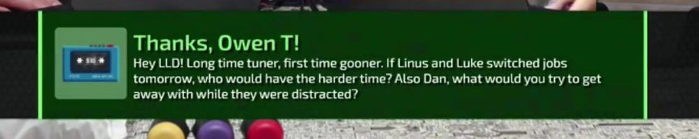 Hey LLD! Long time tuner, first time gooner. If Linus and Luke switched jobs tomorrow, who would have the harder time? Also Dan, what would you try to get away with while they were distracted?