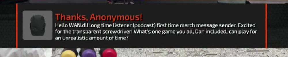 Hello WAN.dll long time listener (podcast) first time merch message sender. Excited for the transparent screwdriver! What's one game you all, Dan included, can play for an unrealistic amount of time?