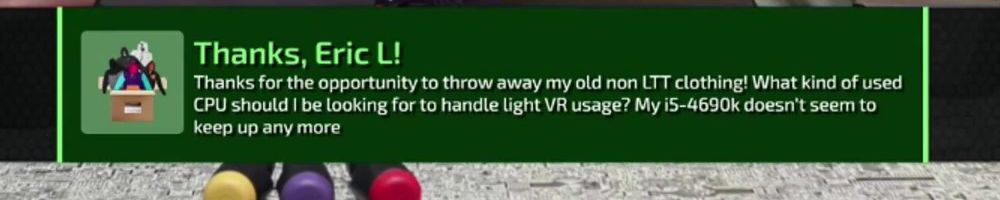 Thanks for the opportunity to throw away my old non LTT clothing! What kind of used CPU should I be looking for to handle light VR usage? My i5-4690k doesn't seem to keep up any more