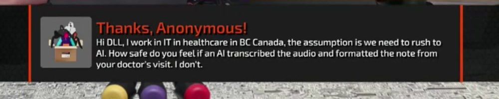 Hi DLL, I work in IT in healthcare in BC Canada, the assumption is we need to rush to AI. How safe do you feel if an AI transcribed the audio and formatted the note from your doctor's visit. I don't.