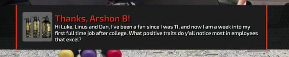 Hi Luke, Linus and Dan, I've been a fan since I was 11, and now I am a week into my first full time job after college. What positive traits do y'all notice most in employees that excel?