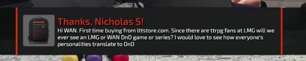 Hi WAN. First time buying from Ittstore.com. Since there are ttrpg fans at LMG will we ever see an LMG or WAN DnD game or series? I would love to see how everyone's personalities translate to DnD