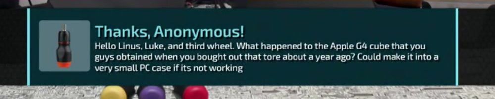 Hello Linus, Luke, and third wheel. What happened to the Apple G4 cube that you guys obtained when you bought out that tore about a year ago? Could make it into a very small PC case if its not working