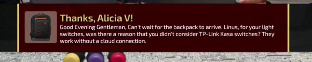 Good Evening Gentleman, Can't wait for the backpack to arrive. Linus, for your light switches, was there a reason that you didn't consider TP-Link Kasa switches? They work without a cloud connection.