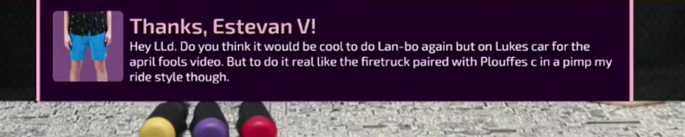Hey LLd. Do you think it would be cool to do Lan-bo again but on Lukes car for the april fools video. But to do it real like the firetruck paired with Plouffes c in a pimp my ride style though.