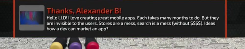 Hello LLD! I love creating great mobile apps. Each takes many months to do. But they are invisible to the users. Stores are a mess, search is a mess (without $$$$). Ideas how a dev can market an app?