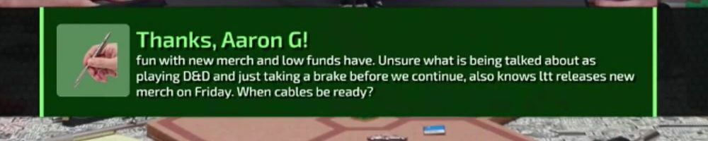 fun with new merch and low funds have. Unsure what is being talked about as playing D&D and just taking a brake before we continue, also knows ltt releases new merch on Friday. When cables be ready?