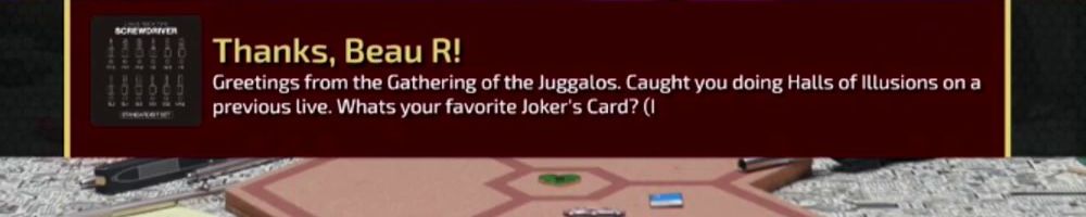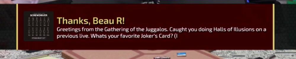 Greetings from the Gathering of the Juggalos. Caught you doing Halls of Illusions on a previous live. Whats your favorite Joker's Card? (I