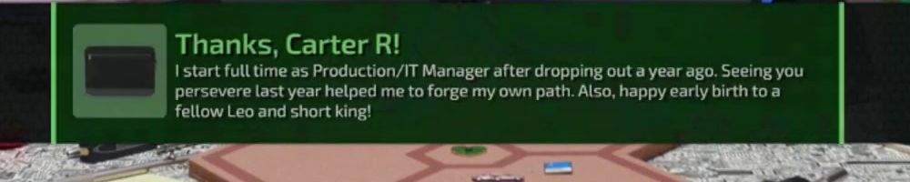 I start full time as Production/IT Manager after dropping out a year ago. Seeing you persevere last year helped me to forge my own path. Also, happy early birth to a fellow Leo and short king!
