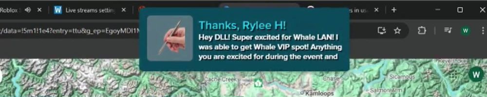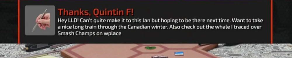 Hey LLD! Can't quite make it to this lan but hoping to be there next time. Want to take a nice long train through the Canadian winter. Also check out the whale I traced over Smash Champs on wplace