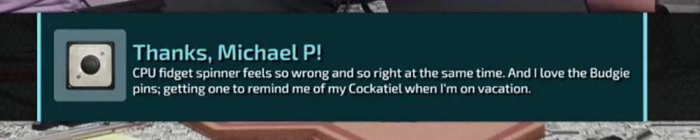 CPU fidget spinner feels so wrong and so right at the same time. And I love the Budgie pins; getting one to remind me of my Cockatiel when I'm on vacation.