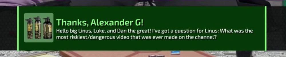 Hello big Linus, Luke, and Dan the great! I've got a question for Linus: What was the most riskiest/dangerous video that was ever made on the channel?
