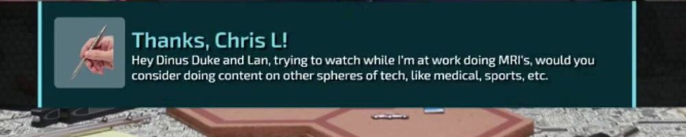 Hey Dinus Duke and Lan, trying to watch while I'm at work doing MRI's, would you consider doing content on other spheres of tech, like medical, sports, etc.