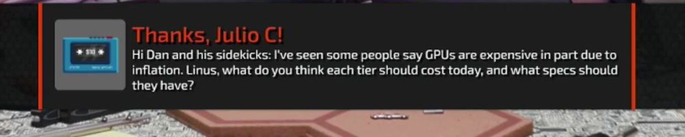Hi Dan and his sidekicks: I've seen some people say GPUs are expensive in part due to inflation. Linus, what do you think each tier should cost today, and what specs should they have?