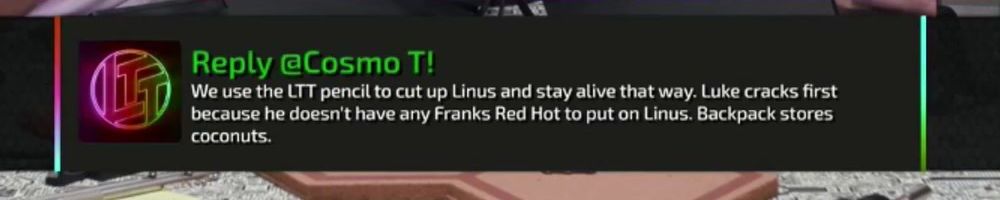 We use the LTT pencil to cut up Linus and stay alive that way. Luke cracks first because he doesn't have any Franks Red Hot to put on Linus. Backpack stores coconuts.