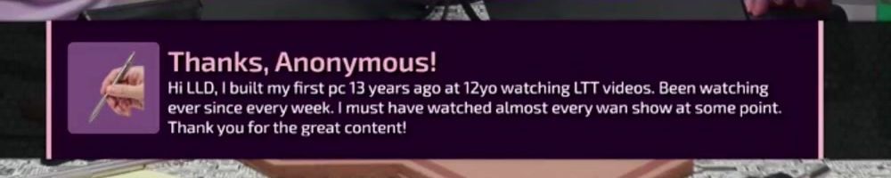 Hi LLD, I built my first pc 13 years ago at 12yo watching LTT videos. Been watching ever since every week. I must have watched almost every wan show at some point. Thank you for the great content!