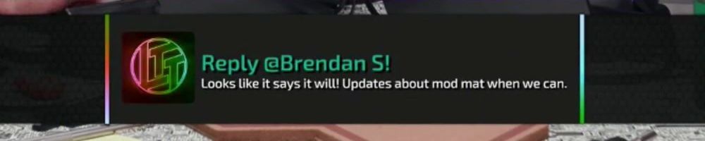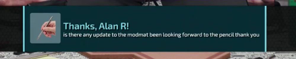 It's been out for a while. Two, any updates on the Mod Mat? Love the show and excited for Whale LAN!