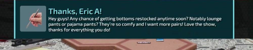 Hey guys! Any chance of getting bottoms restocked anytime soon? Notably lounge pants or pajama pants? They're so comfy and I want more pairs! Love the show, thanks for everything you do!