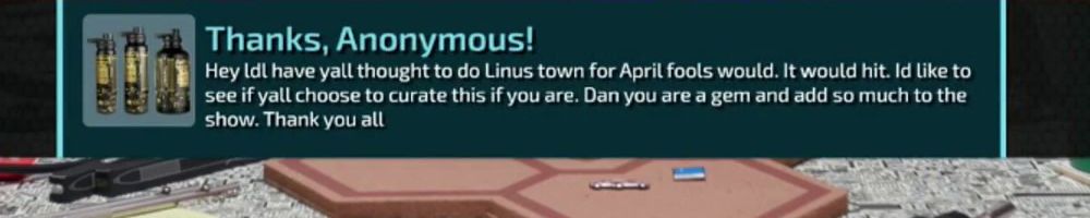 Hey ldl have yall thought to do Linus town for April fools would. It would hit. Id like to see if yall choose to curate this if you are. Dan you are a gem and add so much to the show. Thank you all
