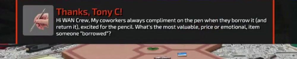 Hi WAN Crew, My coworkers always compliment on the pen when they borrow it (and return it), excited for the pencil. What's the most valuable, price or emotional, item someone "borrowed"?