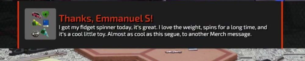 I got my fidget spinner today, it's great. I love the weight, spins for a long time, and it's a cool little toy. Almost as cool as this segue, to another Merch message.