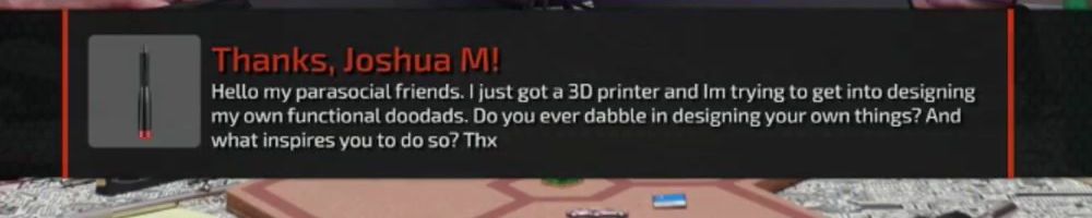 Hello my parasocial friends. I just got a 3D printer and I'm trying to get into designing my own functional doodads. Do you ever dabble in designing your own things? And what inspires you to do so? Thx