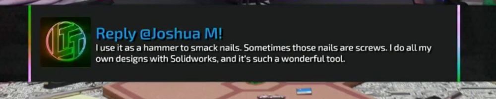 I use it as a hammer to smack nails. Sometimes those nails are screws. I do all my own designs with Solidworks, and it's such a wonderful tool.