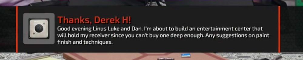 Good evening Linus Luke and Dan. I'm about to build an entertainment center that will hold my receiver since you can't buy one deep enough. Any suggestions on paint finish and techniques.