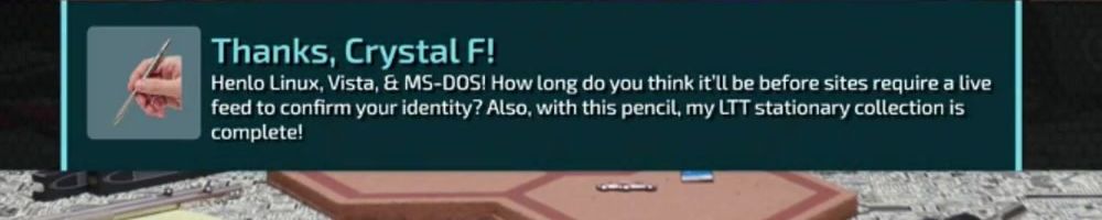 Henlo Linux, Vista, & MS-DOS! How long do you think it'll be before sites require a live feed to confirm your identity? Also, with this pencil, my LTT stationary collection is complete!