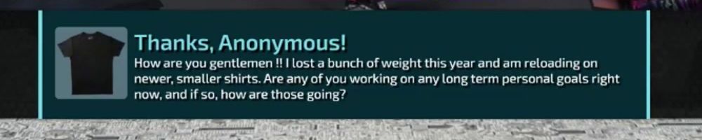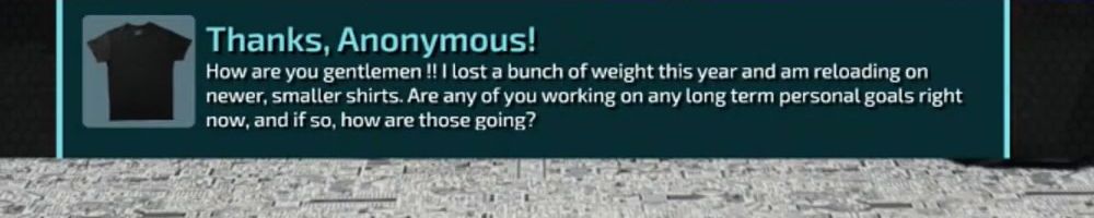 Thanks, Anonymous! How are you gentlemen !! I lost a bunch of weight this year and am reloading on newer, smaller shirts. Are any of you working on any long term personal goals right now, and if so, how are those going?