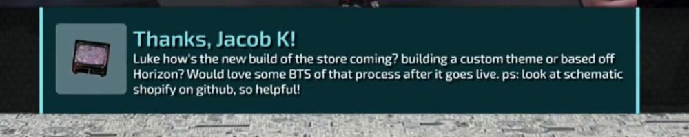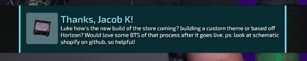Thanks, Jacob K! Luke how's the new build of the store coming? building a custom theme or based off Horizon? Would love some BTS of that process after it goes live. ps: look at schematic shopify on github, so helpful!