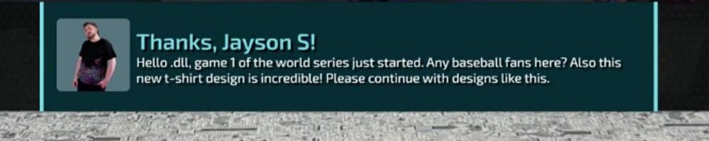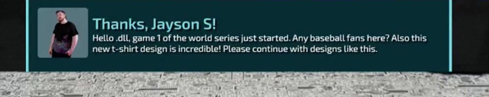 Thanks, Jayson S! Hello .dll, game 1 of the world series just started. Any baseball fans here? Also this new t-shirt design is incredible! Please continue with designs like this.