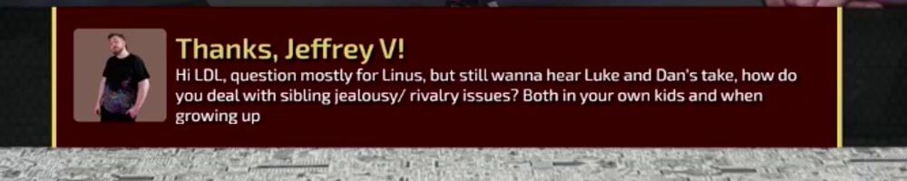 Thanks, Jeffrey V! Hi LDL, question mostly for Linus, but still wanna hear Luke and Dan's take, how do you deal with sibling jealousy/ rivalry issues? Both in your own kids and when growing up