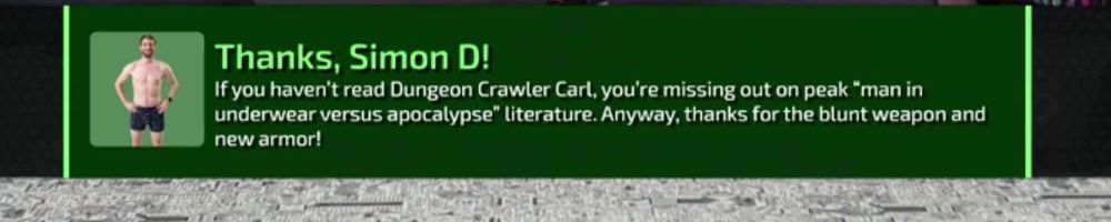 Thanks, Simon D! If you haven't read Dungeon Crawler Carl, you're missing out on peak "man in underwear versus apocalypse" literature. Anyway, thanks for the blunt weapon and new armor!