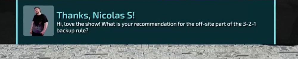 Thanks, Nicolas S! Hi, love the show! What is your recommendation for the off-site part of the 3-2-1 backup rule?
