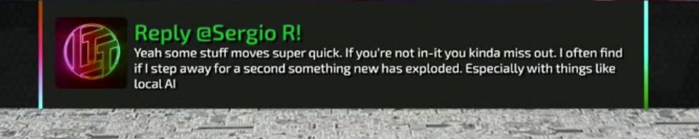Reply @Sergio R! Yeah some stuff moves super quick. If you're not in-it you kinda miss out. I often find if I step away for a second something new has exploded. Especially with things like local AI